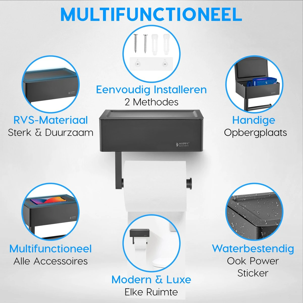 Ook de telefoon kan op het plankje boven op de bak gelegd worden, dus de 3-in-1 wc rolhouder met plankje van Happy Goods dient tegelijkertijd als telefoonhouder! Wanneer je muziek, de radio of je favoriete podcast wilt luisteren, of een leuke serie aan het kijken bent, het is gegarandeerd dat je telefoon veilig ligt. Niemand wilt zijn telefoon in de wc laten vallen toch? De Happy Goods wc rolhouder met plankje voorkomt dit!