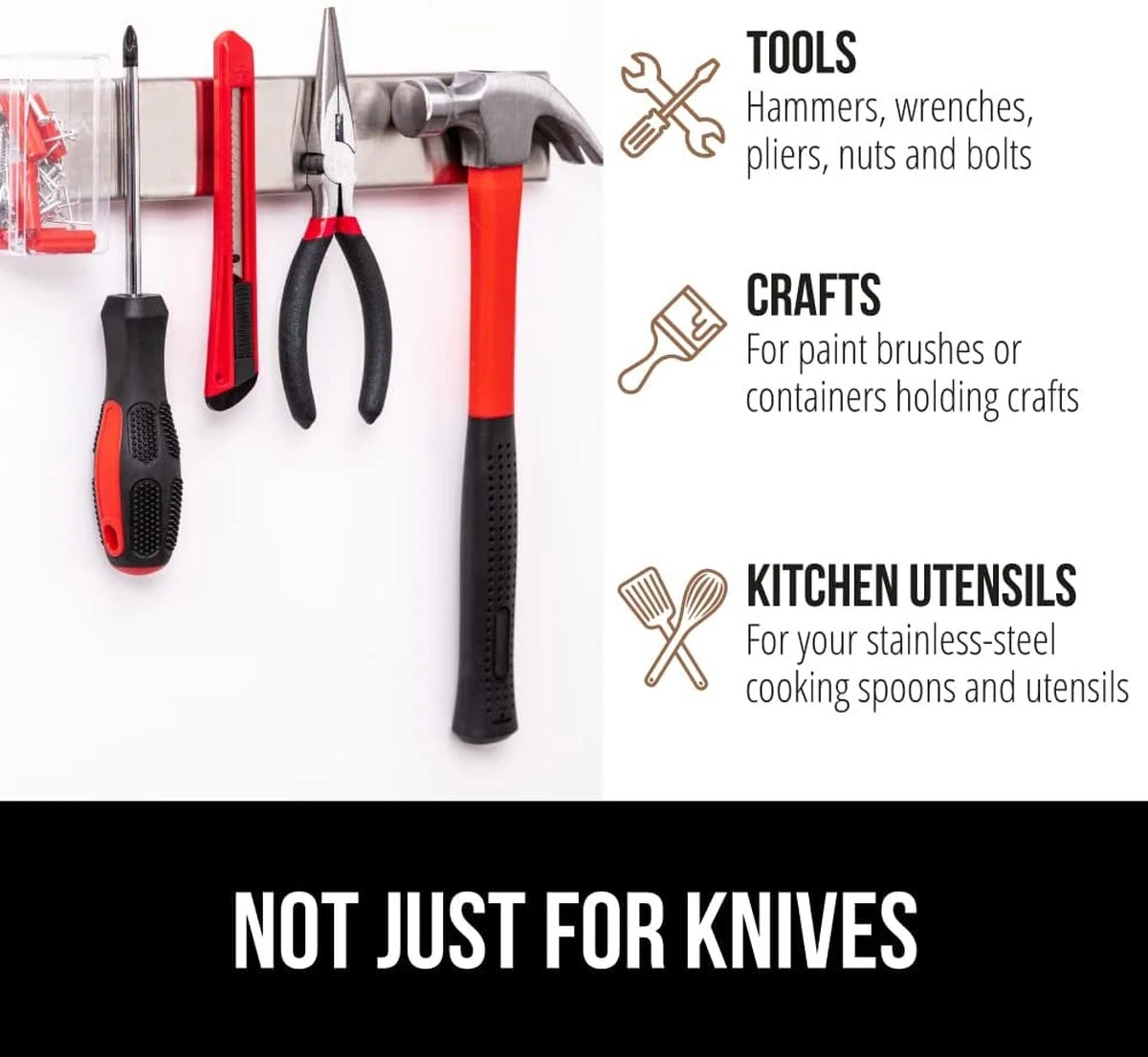 Hang jouw messen op een veilige en eenvoudige manier op zonder te boren met deze magnetische messenhouder. Deze messenhouder is veilig, praktisch en stijlvol. Het magnetische messenblok kan overal worden opgehangen, dus ook gemakkelijk buiten het bereik (hoog ophangen) van kinderen. In vergelijking met een keukenlade of messenblok is deze magnetische messenstrip hygiënischer, simpeler en sneller. Daarbij geeft deze messenhouder ook nog een stijlvolle, strakke en stoere uitstraling aan jouw keuken!