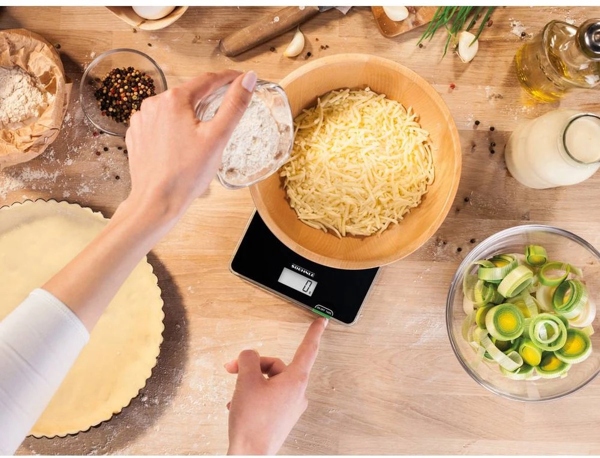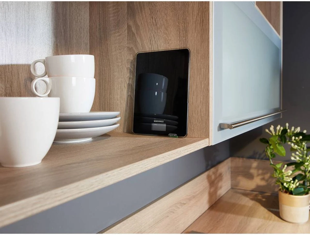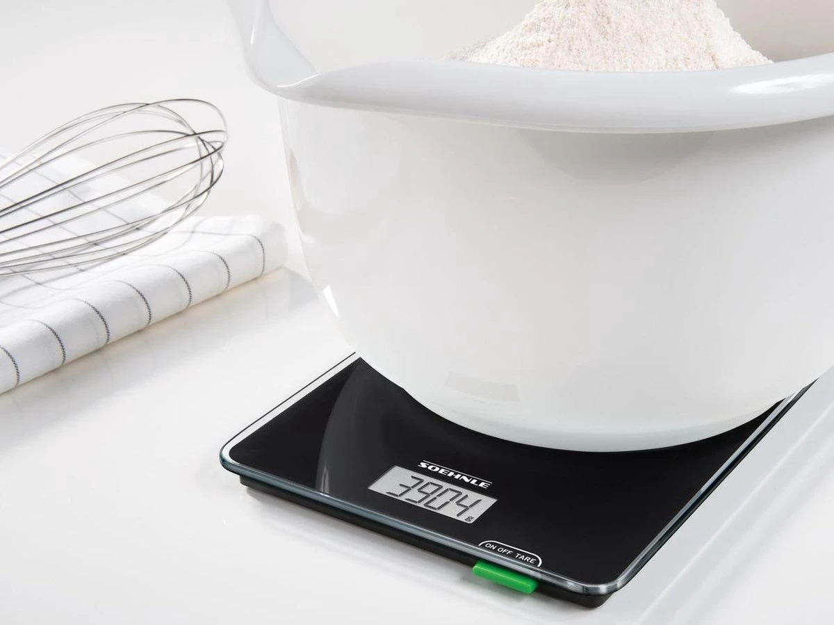 Met zijn aantrekkelijk, tijdloos moderne design en gemakkelijke bediening past de Soehnle keukenweegschaal Page Compact 100 perfect in de starterskeuken. Deze weegschaal is klein en compact, maar presteert daarom zeker niet minder. Hij weegt maximaal 5 kg en tot op 1 gram nauwkeurig. Met goed leesbaar lcd-display en praktische bijweegfunctie (tarra) – belangrijke functies bij het dagelijks gebruik. De Page Compact 100 is een bijzonder platte compacte weegschaal die zeer plaatsbesparend opgeborgen kan worden. De weegschaal gaat automatisch uit. Dat bespaart veel energie. De meegeleverde batterijen gaan zelfs bij tweemaal daags gebruik wel twee jaar mee. De batterijen zitten veilig in de batterijbehuizing dat stevig vastgeschroefd kan worden. Zo blijven ze buiten bereik van kinderhandjes.