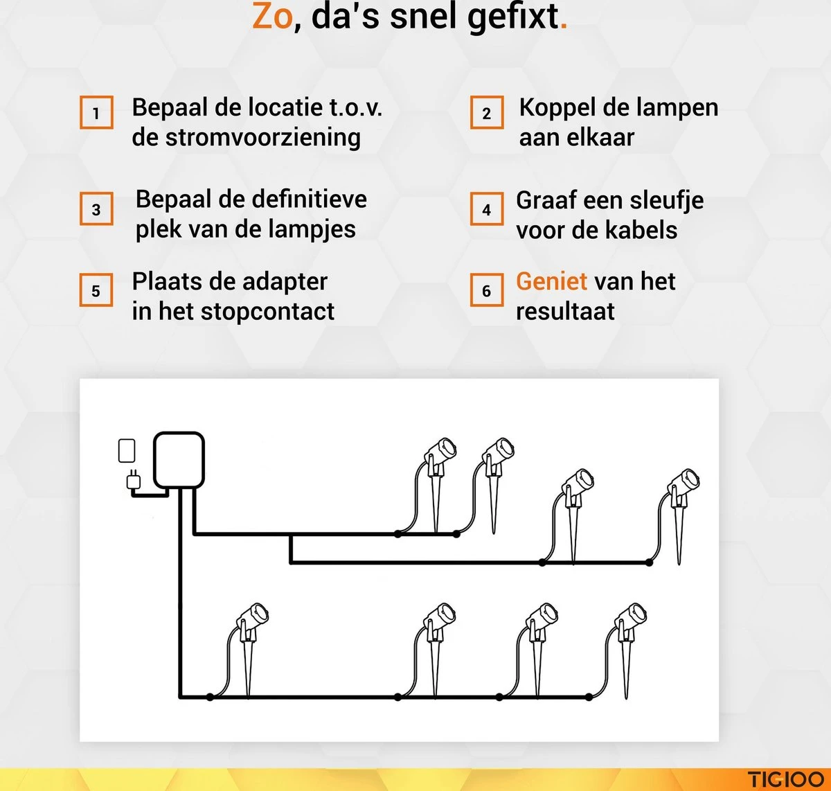 Dankzij onze laagspanningstechnologie kun je je buitenverlichting in de meegeleverde laagspanning adapter steken er is geen ingewikkelde bedrading nodig. Met behulp van de meegeleverd accessoires, installeer je deze lampen binnen no-time.