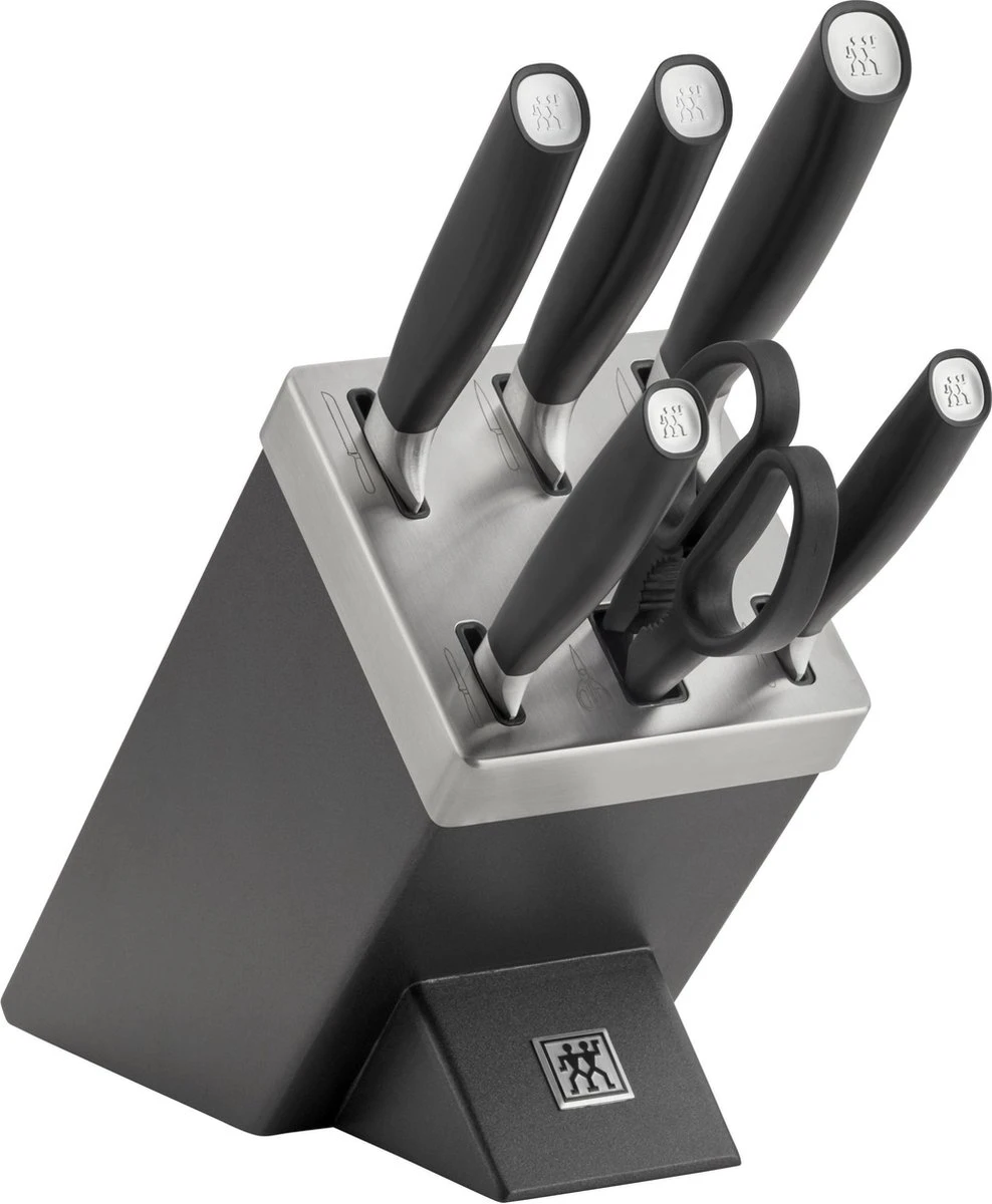 Een messenblok en slijpsteen in één: het messenblok uit de ZWILLING ALL*STAR-reeks doet automatisch het slijpwerk voor u. Hoe? Met de keramische slijpstenen in de gleuven voor gladde messen. Die zijn zo uitgelijnd dat je automatisch de snede slijpt telkens als je het mes in de gleuf steekt en eruit trekt – zo blijven de keukenmessen lang mooi scherp. Een bijzonder kenmerk van de messen is het premiumlogo. Daarvoor kun je zelf kiezen welke kleur het beste bij jouw keuken en levensstijl past, bijvoorbeeld een elegante zilvertint.